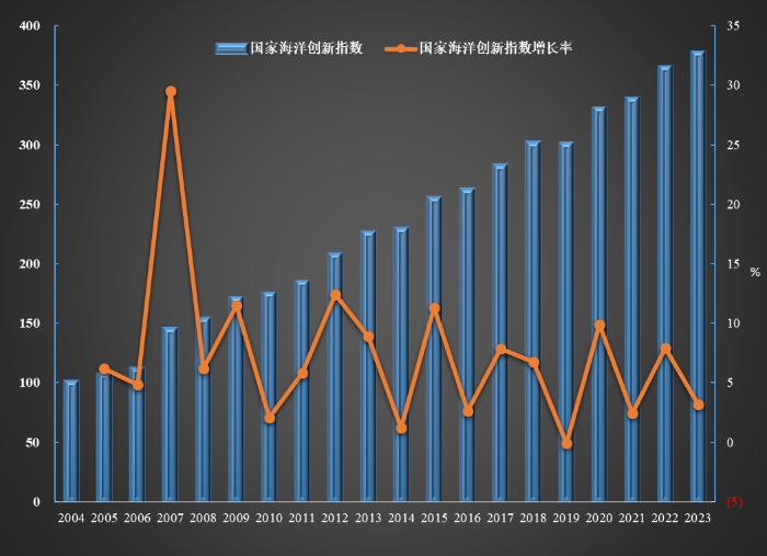 《報(bào)告》基于科技創(chuàng)新、區(qū)域創(chuàng)新系統(tǒng)及海洋可持續(xù)發(fā)展理論,構(gòu)建了涵蓋海洋創(chuàng)新資源、知識(shí)創(chuàng)造、創(chuàng)新績(jī)效、創(chuàng)新環(huán)境四大維度的評(píng)價(jià)體系,對(duì)2004—2023年近20年國(guó)家海洋創(chuàng)新能力進(jìn)行了定量測(cè)算及發(fā)展趨勢(shì)分析。結(jié)果顯示,國(guó)家海洋創(chuàng)新指數(shù)年均增長(zhǎng)率為7.23%,標(biāo)志著我國(guó)海洋創(chuàng)新生態(tài)持續(xù)優(yōu)化,核心創(chuàng)新能力穩(wěn)步提升。