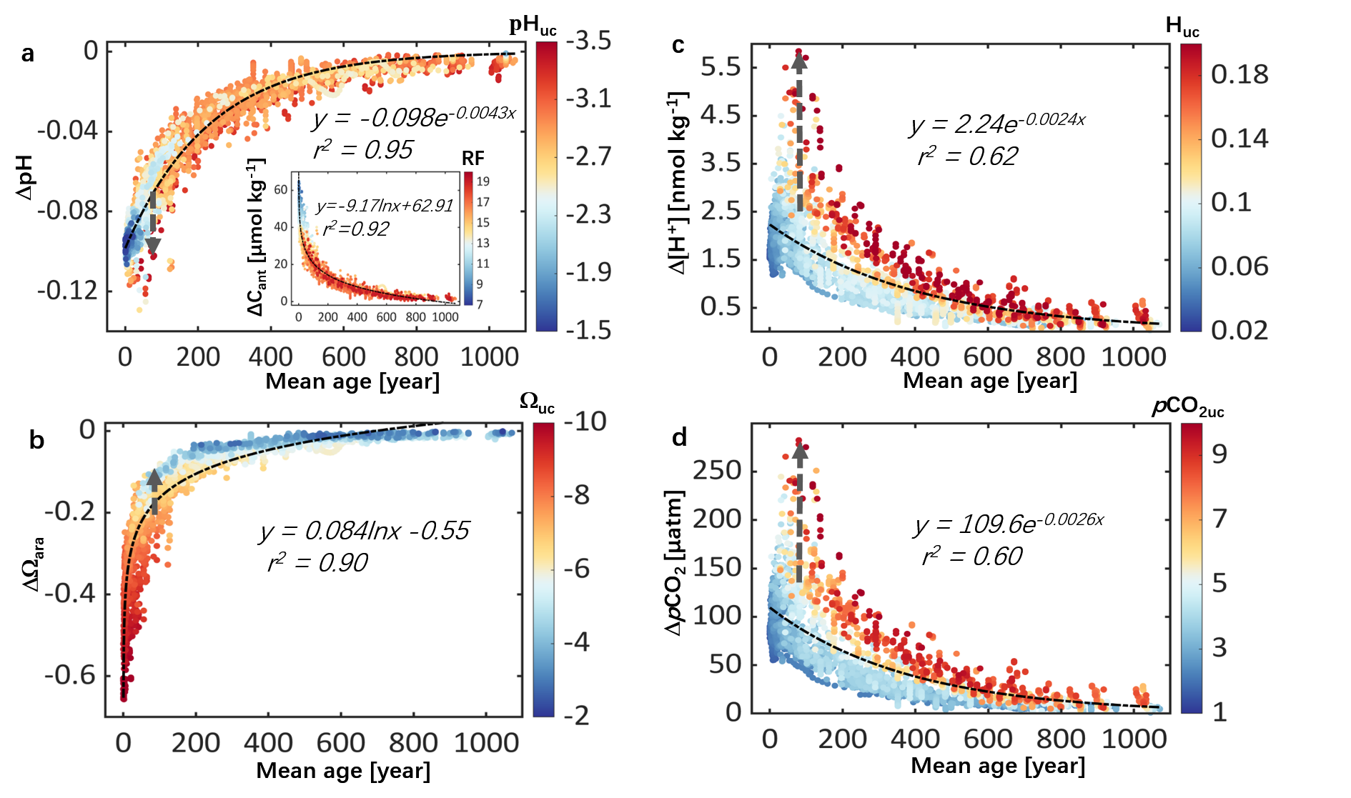 圖 2水團(tuán)年齡與ΔpH(a)、ΔΩara(b)、Δ[H?](c)和ΔpCO2(d)的相關(guān)性。其中,pCO2uc, Huc, pHuc and Ωuc分別表示單位人為CO2增加引起的酸化指標(biāo)的絕對變化。