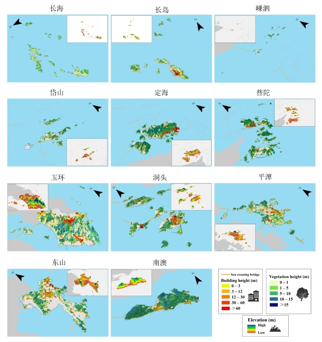 在前期研究基礎(chǔ)上,進(jìn)一步拓展空間尺度與維度,首次在全國(guó)尺度上選取11個(gè)海島縣(市、區(qū))共205個(gè)有居民海島,構(gòu)建了海島三維景觀評(píng)估與分區(qū)框架。綜合考慮地形起伏、植被冠層高度和建筑體積等垂直維度信息,創(chuàng)建三維人類(lèi)干擾指數(shù)、三維景觀破碎度指數(shù)、三維植被指數(shù)和三維建筑指數(shù)等指標(biāo)。