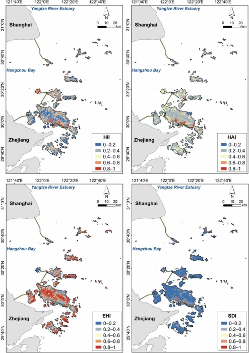 以我國(guó)最大群島——舟山群島為研究區(qū),提出針對(duì)海島的人類(lèi)干擾指數(shù)、人類(lèi)輔助指數(shù)、生態(tài)健康指數(shù)、社會(huì)發(fā)展指數(shù)四項(xiàng)空間化指標(biāo),實(shí)現(xiàn)了對(duì)海島人類(lèi)活動(dòng)強(qiáng)度與社會(huì)-生態(tài)系統(tǒng)的同步量化與空間表達(dá)。
