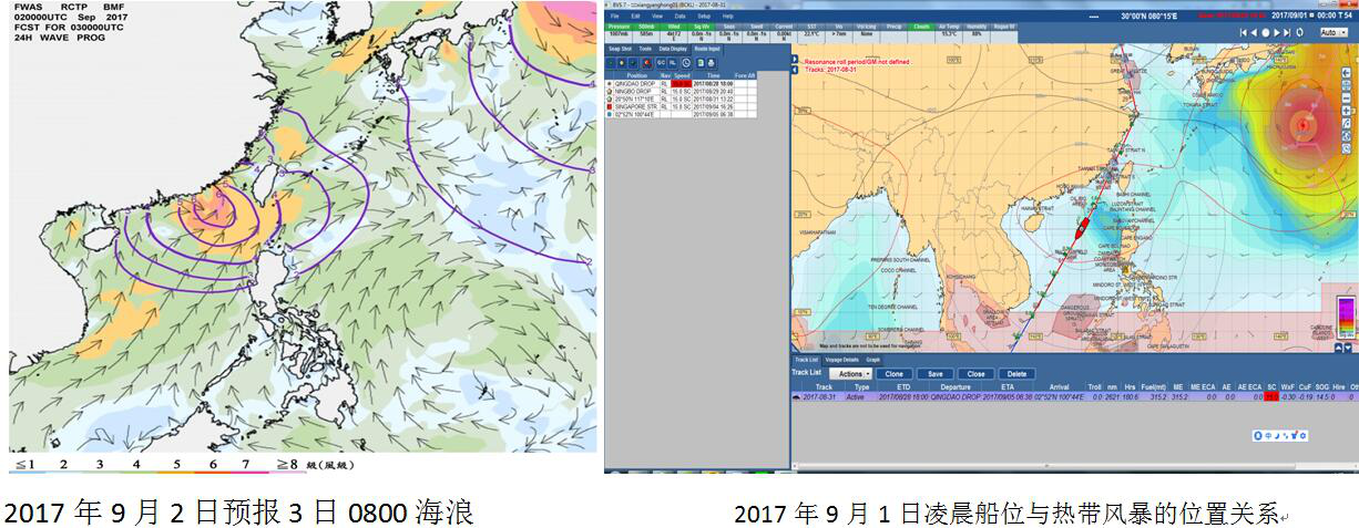 海上的天氣還真是多變,關(guān)注海上天氣的人們已經(jīng)注意到,在呂宋島附近的熱帶低氣壓,于昨天形成熱帶風(fēng)暴,之后將增強(qiáng)為強(qiáng)熱帶風(fēng)暴,對(duì)船舶航行的影響可能在1號(hào)凌晨至中午這段時(shí)間,31日晚上氣象預(yù)報(bào)員和船長(zhǎng)一起把天氣形勢(shì)分析給大家看,從天氣圖上看最糟糕的時(shí)間是距離風(fēng)暴最近的那段時(shí)間,風(fēng)力最大時(shí)東北風(fēng)6~7級(jí),順風(fēng)航行正常情況下不會(huì)對(duì)我輪造成影響,經(jīng)過船上當(dāng)天的碰頭會(huì),確定向陽紅01船繼續(xù)按計(jì)劃航線快速南下,但船還是做最壞的打算,提前把甲板的設(shè)備再次檢查加固,同時(shí)做好向西改變計(jì)劃航線的準(zhǔn)備,各部門會(huì)后馬上行動(dòng),確保即使16號(hào)風(fēng)暴外圍影響我們,也絕不會(huì)帶來安全問題。附兩張?zhí)鞖鈭D。
